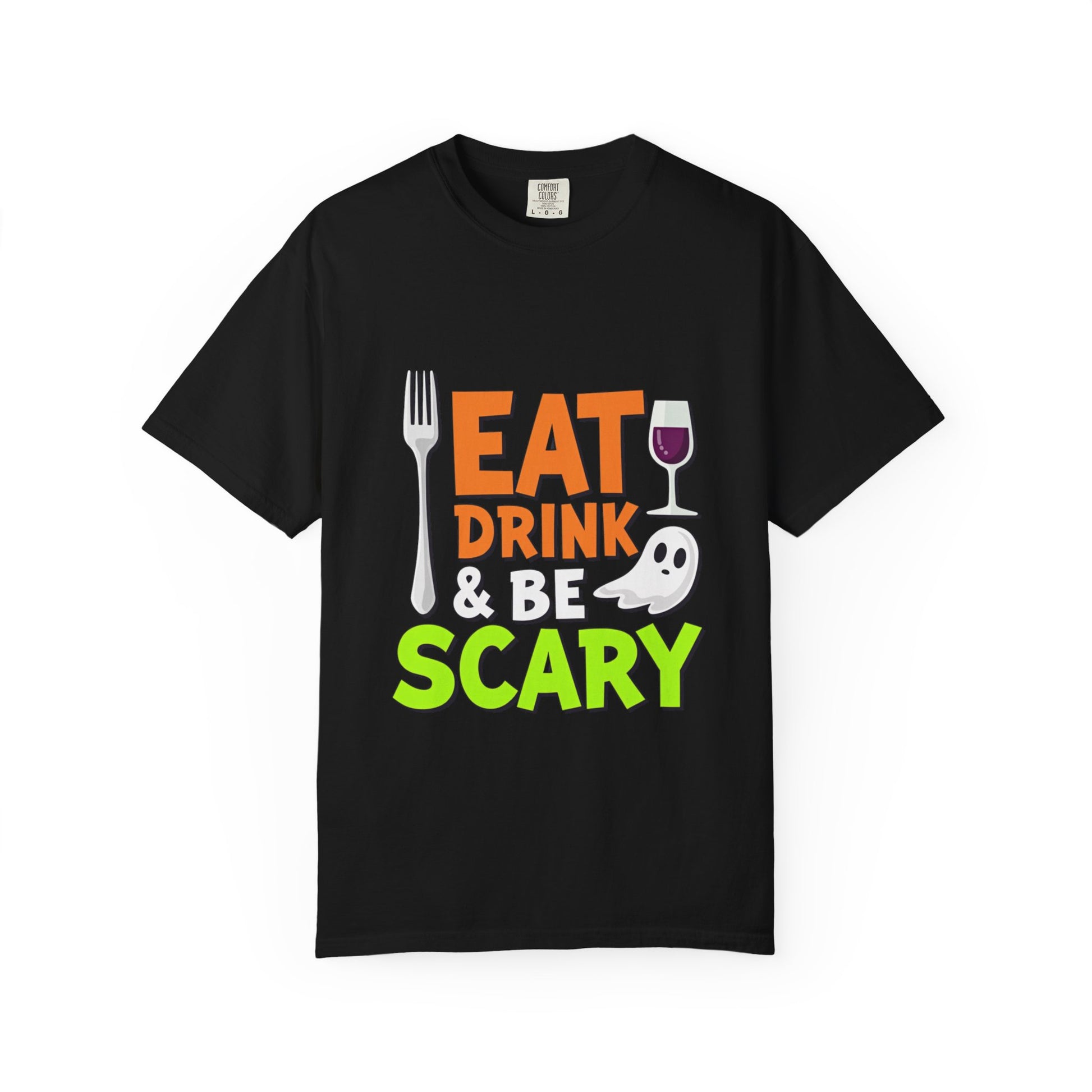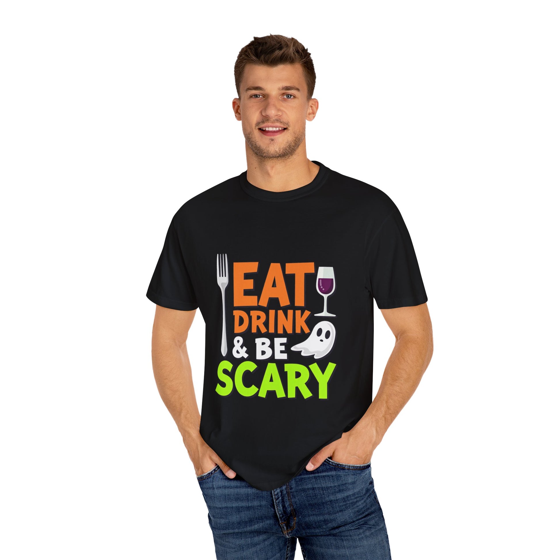 Introducing our relaxed fit unisex garment-dyed T-shirt, perfect for adding a dash of fun to your wardrobe. This t-shirt features a playful "Eat, Drink & Be Scary" design that sets the tone for festive gatherings and Halloween celebrations. Crafted from 100% ring-spun US cotton, it offers supreme soft comfort and a classic crew neckline, ideal for casual or semi-formal occasions. With 58 vibrant colors available, you can easily match it to your personal style. Whether you're hosting a Halloween party or simply enjoying a night out with friends, this t-shirt will make you feel spirited and festive! It's an excellent gift for adults who love to celebrate holidays and dress up for special occasions.