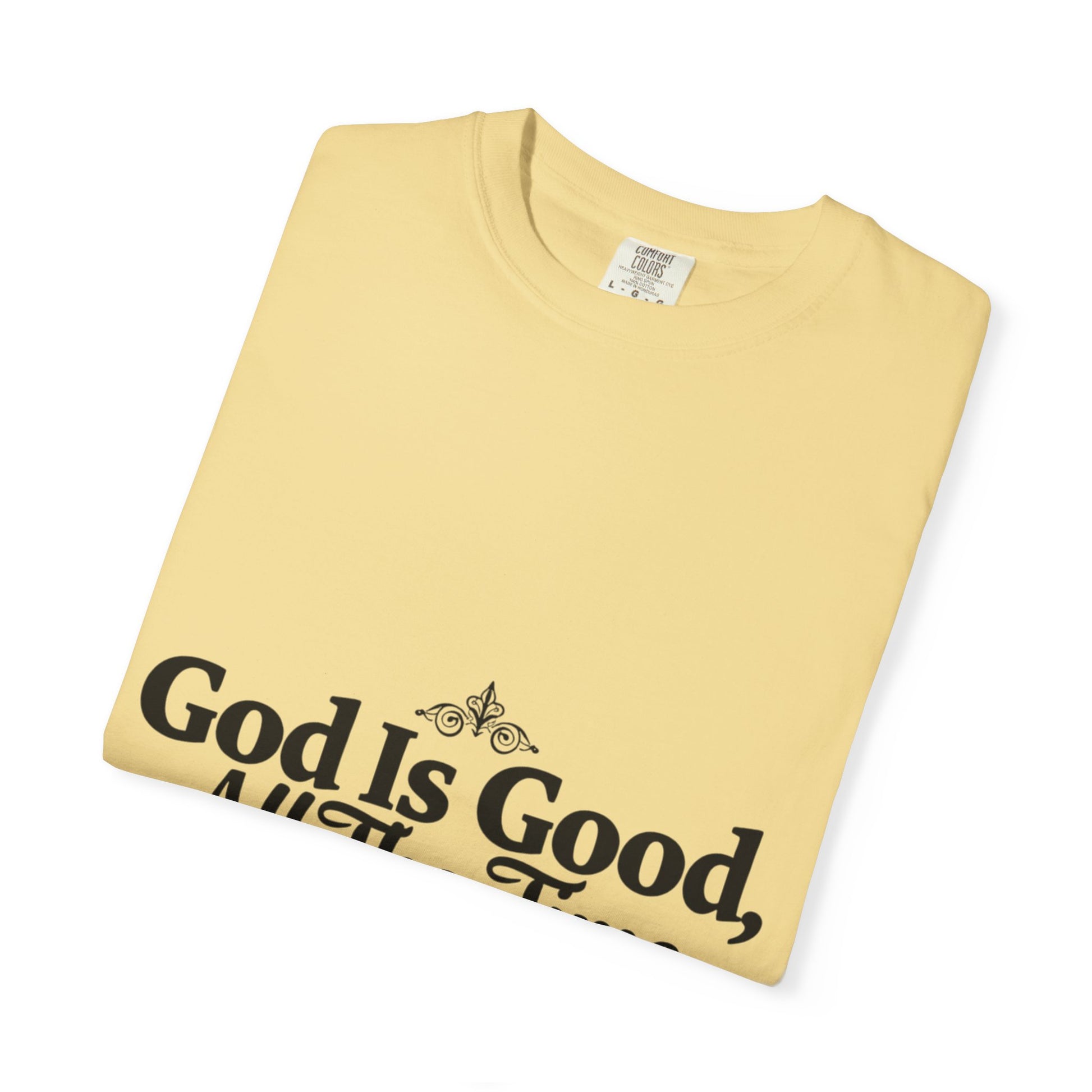 Experience the comfort and classic style of our unisex garment-dyed t-shirt. This versatile tee is perfect for everyday wear, providing a relaxed fit that keeps you feeling great whether you're running errands or gathering with friends. Ideal for anyone who values both comfort and style, this t-shirt beautifully combines casual ease with the option to be dressed up with your favorite accessories. Its soft colors and textures create a warm, inviting vibe, making it a thoughtful gift for celebrations such as birthdays, holidays, or just because. Suitable for adults, this shirt resonates with those who appreciate quality apparel with a meaningful message, like 'God Is Good, All The Time.'